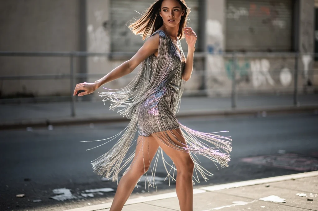 Rien n’égale la magie d’une jupe ou d’une veste à franges scintillantes quand la lumière accompagne chaque geste. Cet aspect mouvant crée un impact immédiat, aussi bien en photo qu’en réalité. La fluidité et l’intensité lumineuse produites mettent naturellement en valeur toutes les morphologies.
